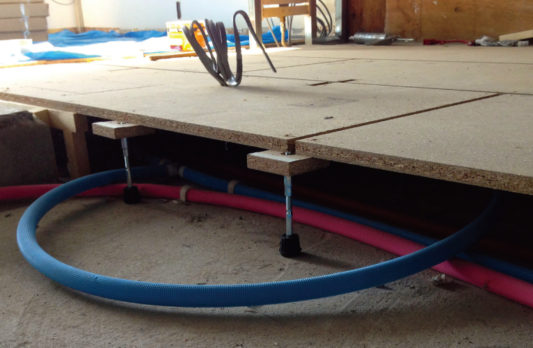 | 置床工事のメリット | ○床下に空間を設けられる為、給水、給湯管やガス管・電気配線など比較的自由に通すことができます |